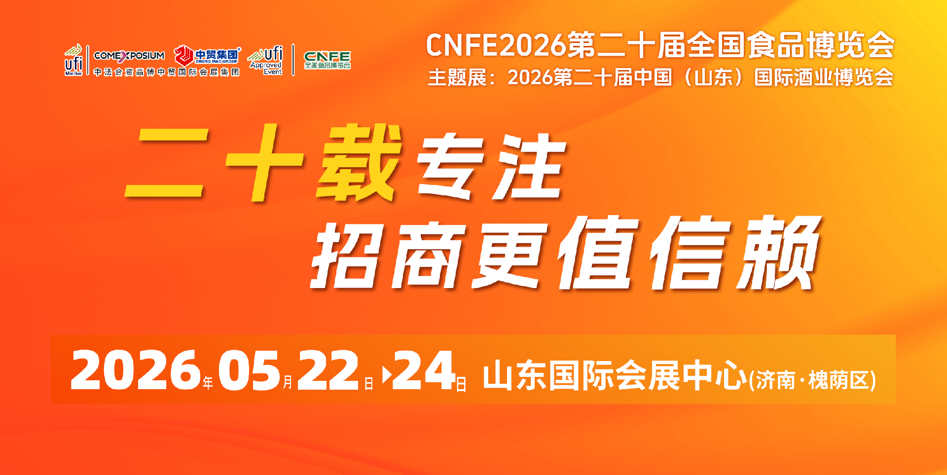 CNFE2026第二十屆全國食品博覽會將于2026年5月22-24日在濟南市山東國際會展中心舉辦。【主題展:2026第二十屆中國(山東)國際酒業(yè)博覽會,同期展:···