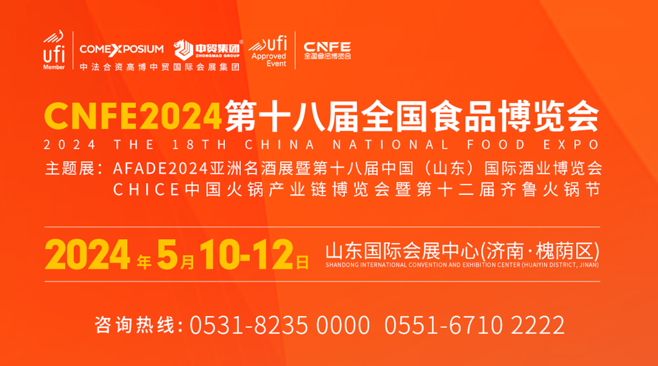 CNFE2024第十八屆全國(guó)食品博覽會(huì)將于2024年5月10日-12日在濟(jì)南市山東國(guó)際會(huì)展中心(槐蔭區(qū))盛大舉辦。【主題展:AFADE2024亞洲名酒展暨第十八屆中國(guó)(山東)國(guó)際酒業(yè)博覽會(huì)、CHICE2024中國(guó)火鍋產(chǎn)業(yè)鏈博覽會(huì)暨第十二屆齊魯火鍋節(jié)】